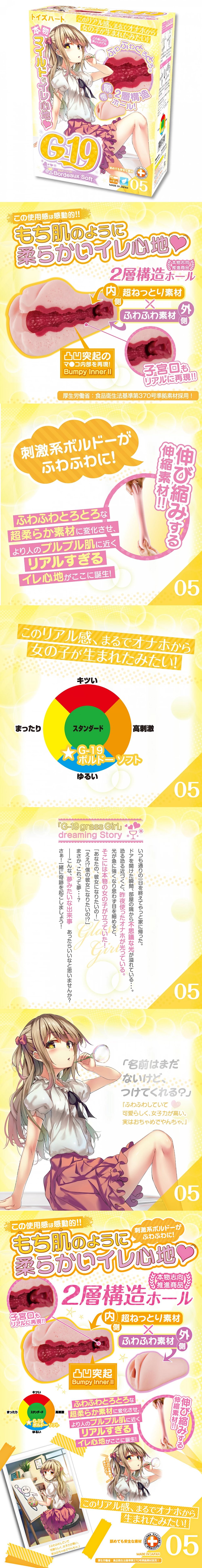 G-19 波爾多 軟版將真實感進一步提升,外層採用了嶄新的超軟身素材製造,加入了無數小氣泡,手持質感比同系列產品更加鬆軟,有彈性。內層物質軟硬適中,無數的肉粒加強了管道內的刺激度。頂部設有子宮口,能增加刺激感,更可令龜頭感覺額外吸吮感。
