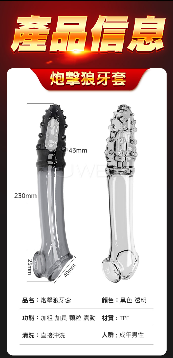 ►您現在的位置:首頁>WOLF S FANG槍槍砲擊.3D立體螺紋顆粒狼牙套 - 透明