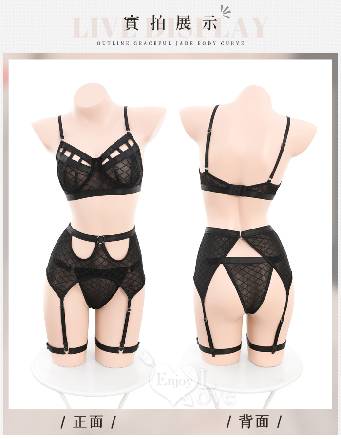 情趣比基尼!菱格紋網紗透視連腰吊襪帶四件式套裝﹝紅﹞