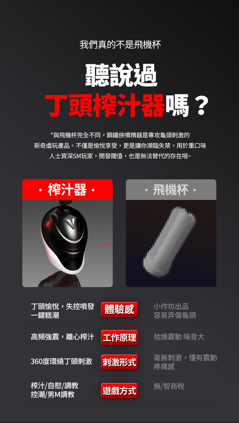 比飛機杯還爽的男用龜頭強制榨精機來了! 專業等級虐龜高頻震動器, 強制讓你的龜無法受控, 無限顫抖噴精 多種體位可嘗試, 全機防水可充電, 多段變頻、一鍵暴汁! 用途:男性自慰之用 材質:ABS、矽膠 規格:電壓3.7V震動/9頻 電源:USB充電 淨重:約450g 總重:約627g 尺寸:長81x寬62mm 低噪音:50分貝以內 備註:內附USB Type-C充電線x1、說明書x1、10ml潤滑液x2(潤滑液保存年限3年) 注意:請與潤滑液共用.並保存於陰涼處,欲重覆使用.用後清水沖洗。 ※情趣用品屬於個人衛生用品,經拆封使用,無法接受退換貨!※ ※每台電腦的解析度皆不同,可能有些微色差,顏色皆以實品為主!※