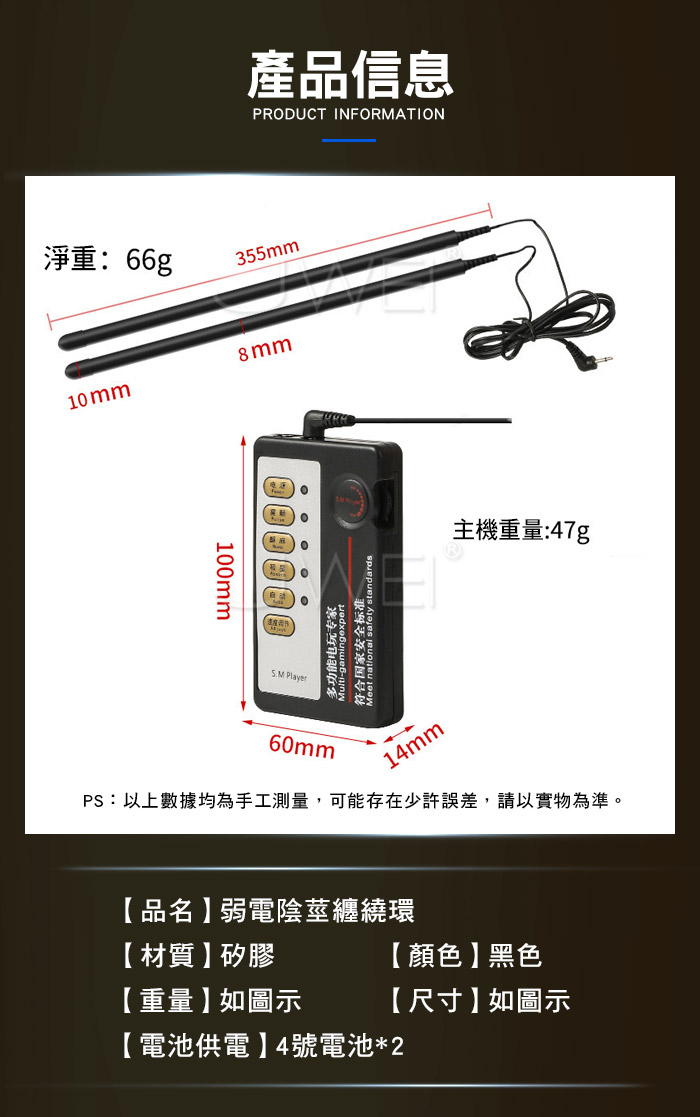 纏繞環訓練 多頻率電流刺激 創新電流刺激,透過使用電頻脈衝刺激皮膚傳導 直接作用於感覺神經細胞,從而產生強烈快感 且自由彎曲 隨意調節大小 任由喜好調整! 產品規格 ■尺寸:大小詳如圖片標示 ■供電: 4號電池*2 ■材質:矽膠 ■特色:電流刺激、自由調整