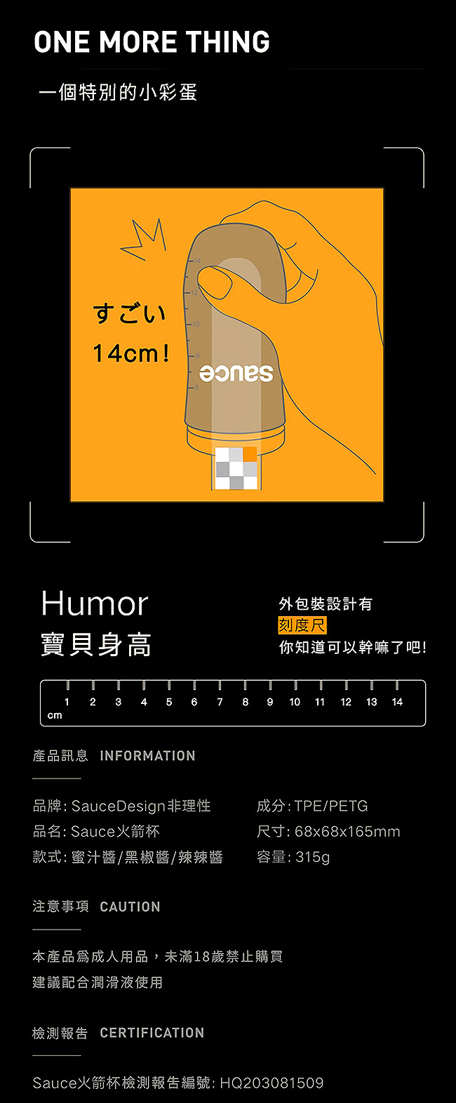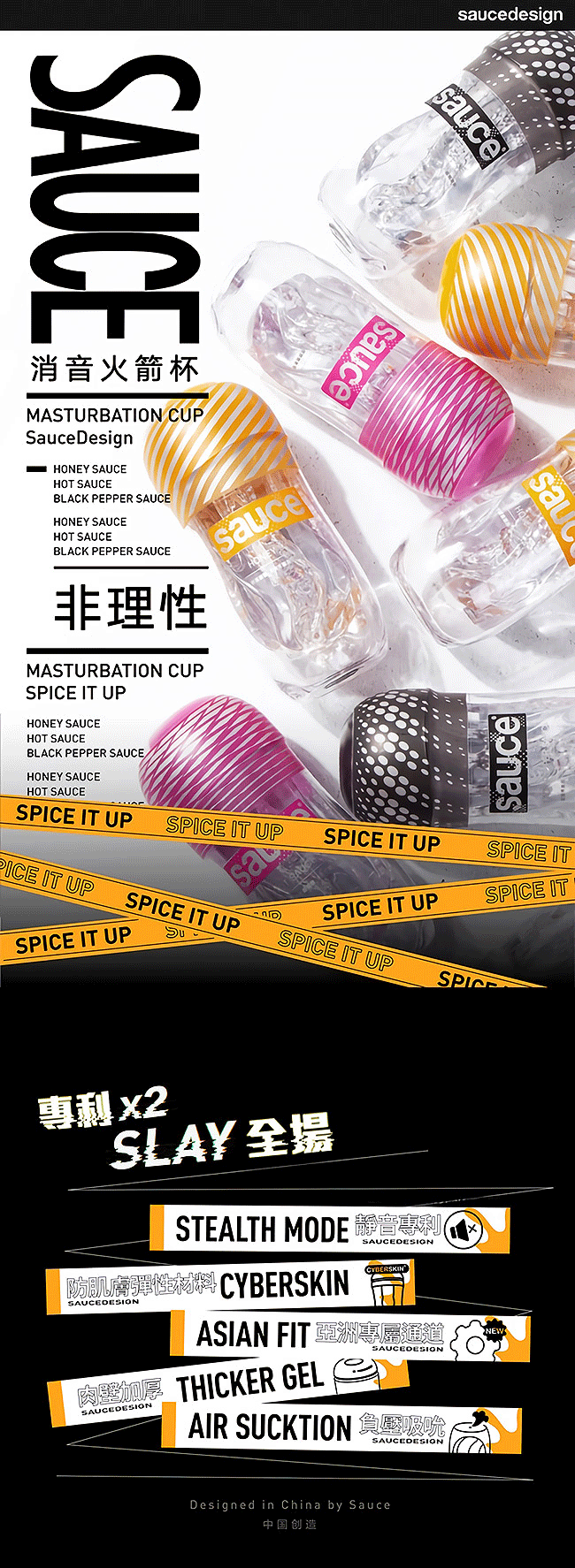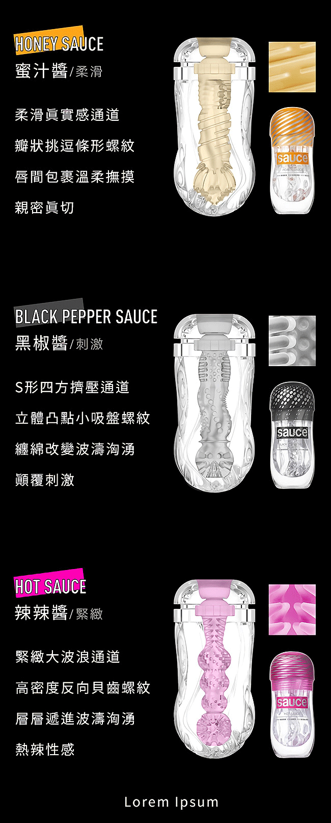 Sauce.辣辣醬消音火箭杯專為亞洲男性設計更加貼合寶貝尺寸,內部空間壓感親密自如。絕佳靜音氣阻設計讓您在使用中不再出現令人尷尬的“啾揪”聲。採用虛擬肌膚精緻技術醫療級TPE,安全柔彈易清洗可重覆使用唷~辣辣醬採緊緻大波浪通道,高密度貝齒螺紋層層遞進波濤洶湧熱辣性感。