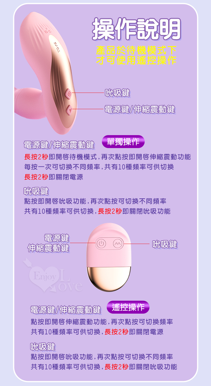 ►您現在的位置:首頁>LILO 來樂 ‧ TABENA 戴貝娜 無線遥控~伸缩抽插+震動+吮吸頂到糕潮按摩器-雙10頻獨立控制可穿戴內褲調教﹝櫻花粉﹞
