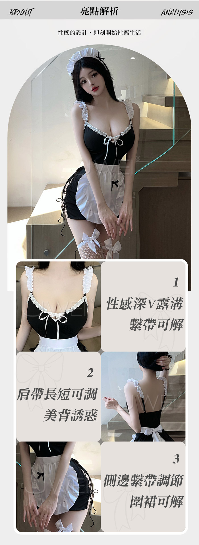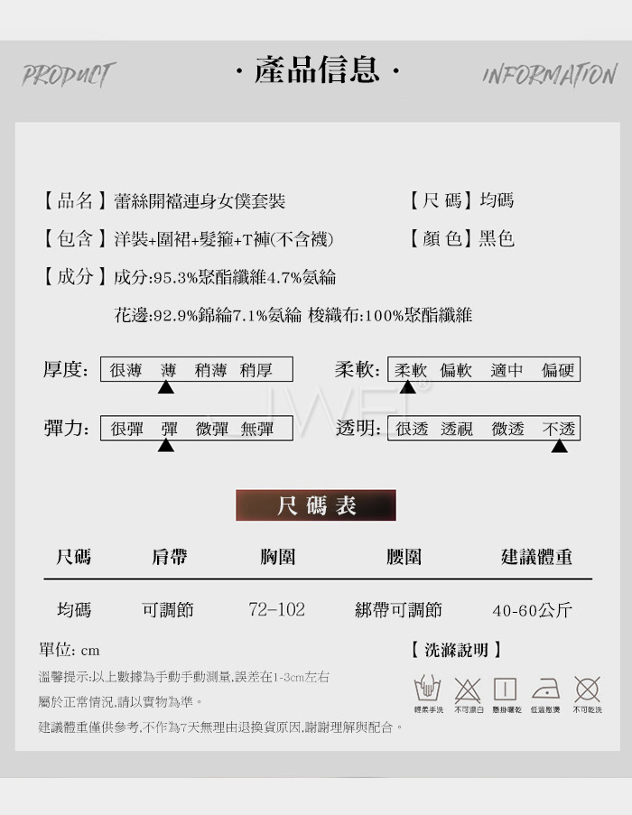 ■內容物:洋裝+圍裙+髮箍+T褲 ■適穿尺寸:FREESIZE ■彈性:些許 ■未撐開平量尺寸正負誤差1~2cm,1吋=2.54cm ■注意事項:基於保障消費者個人衛生,此貼身衣物恕不接受退換貨。 (如為商品本身暇疵,接受七日內換貨,請勿試穿,謝謝您)