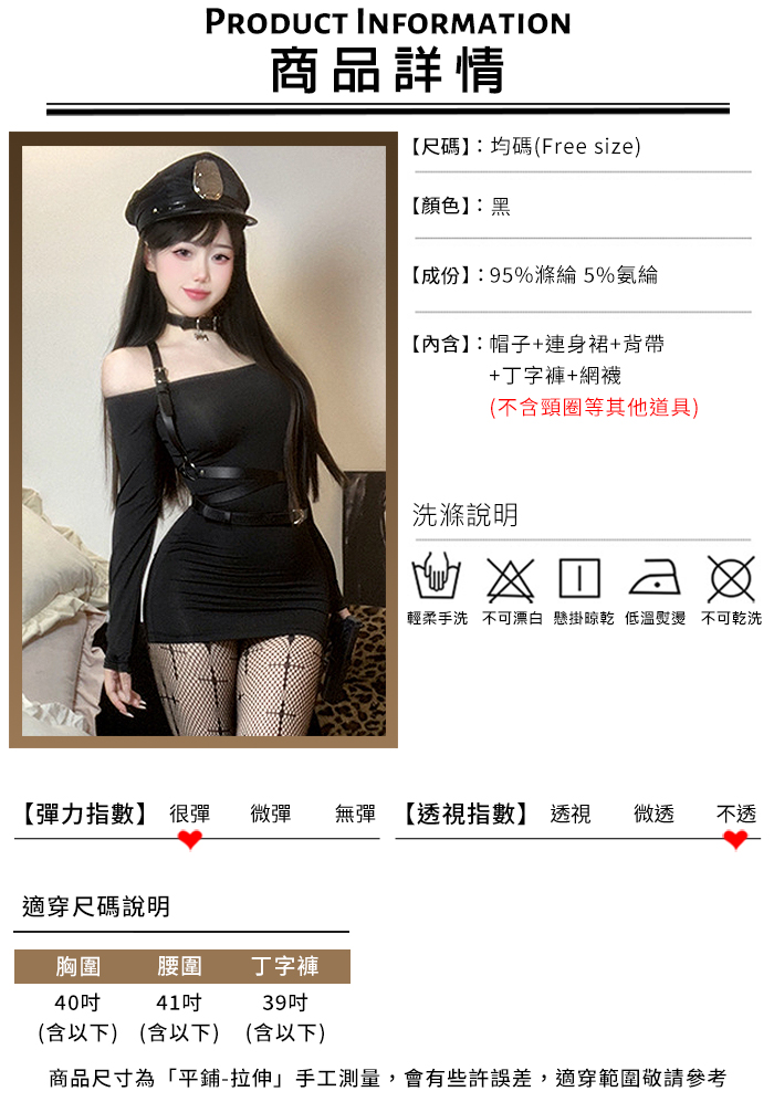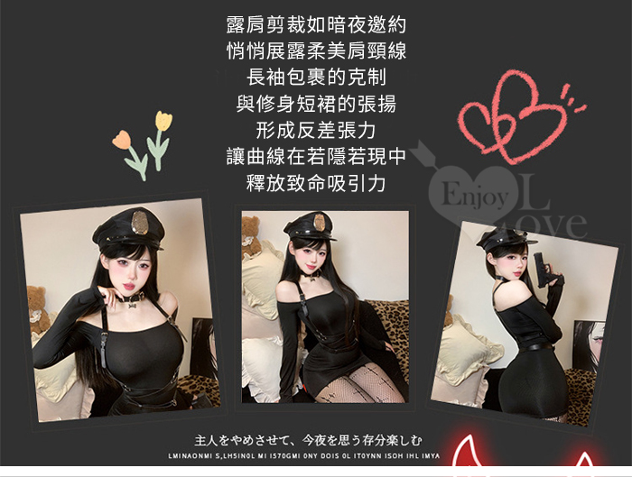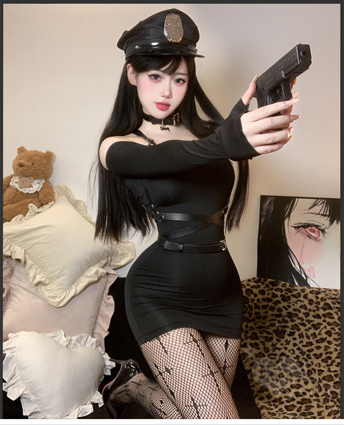 | 女警角色扮演服!率性一字領露肩連身裙搭十字網襪含背帶五件式套裝