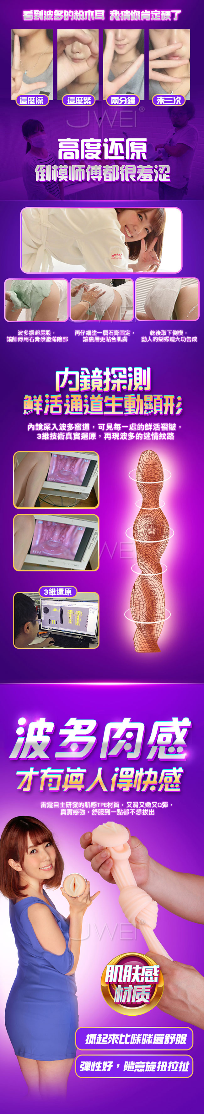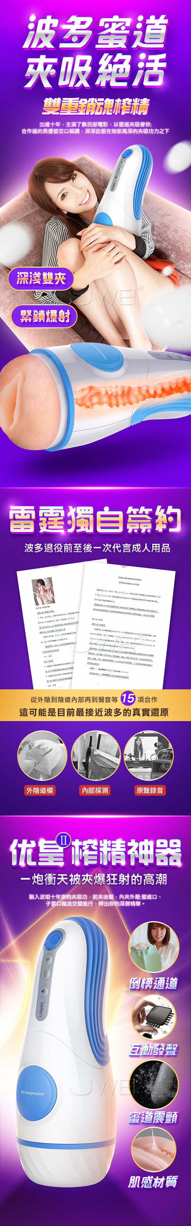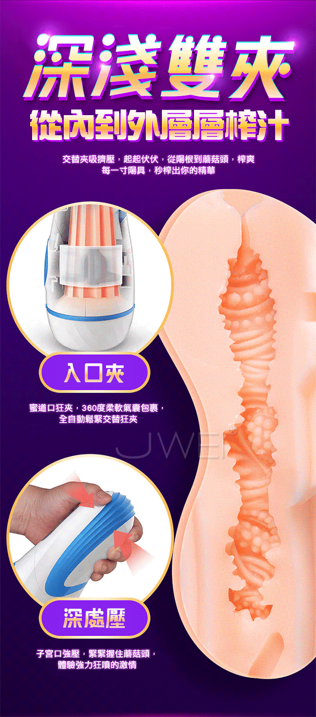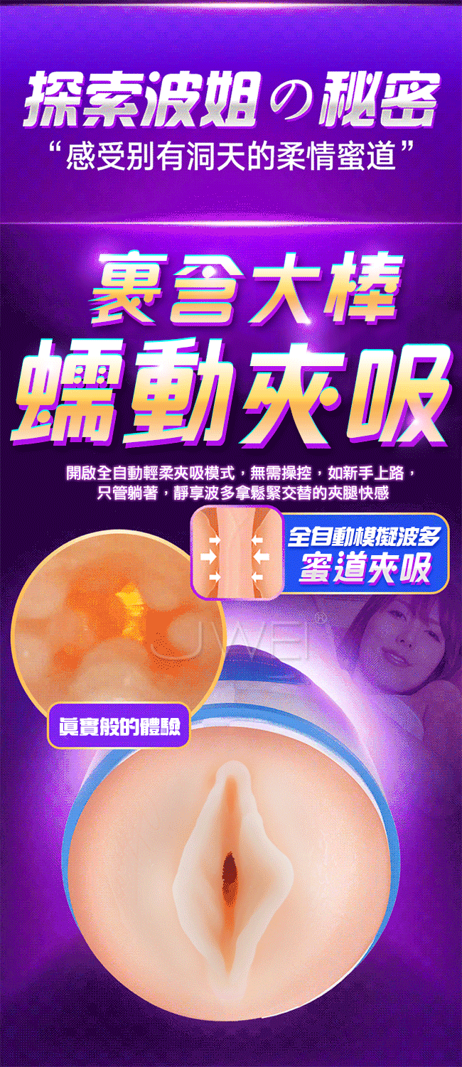 榨精神器採深淺雙替夾吸,以蜜道夾吸著你讓您深深臣服在她那高深的夾吸功力之下!開啟全自動輕柔夾吸模式,無需操控只管躺著就能享受全自動模擬女神波多的蜜夾吸。1:1還原波多私處蜜道,讓您日夜享用真女神!並且擁有智能叫床你怎麼動她就怎麼叫,全程配合你任您玩弄喔。