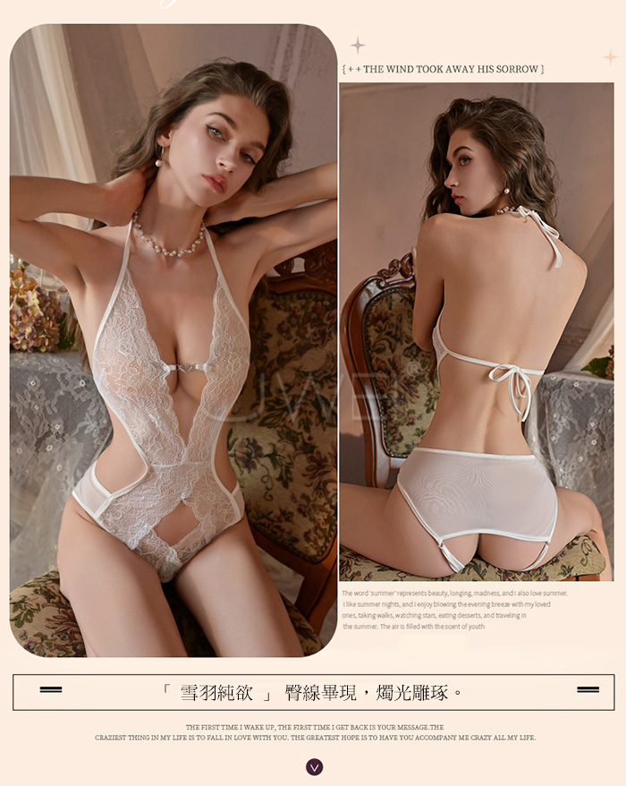 | 繁花似錦.深V愛心鑽飾露胸掛脖繫帶美背蕾絲開襠連體衣【白色】