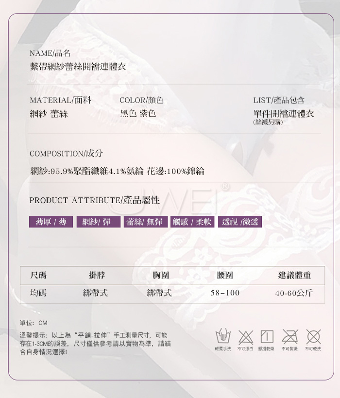 ■內容物:單件連體衣 ■適穿尺寸:FREESIZE ■彈性:彈 ■未撐開平量尺寸正負誤差1~2cm,1吋=2.54cm ■注意事項:基於保障消費者個人衛生,此貼身衣物恕不接受退換貨。 (如為商品本身暇疵,接受七日內換貨,請勿試穿,謝謝您)